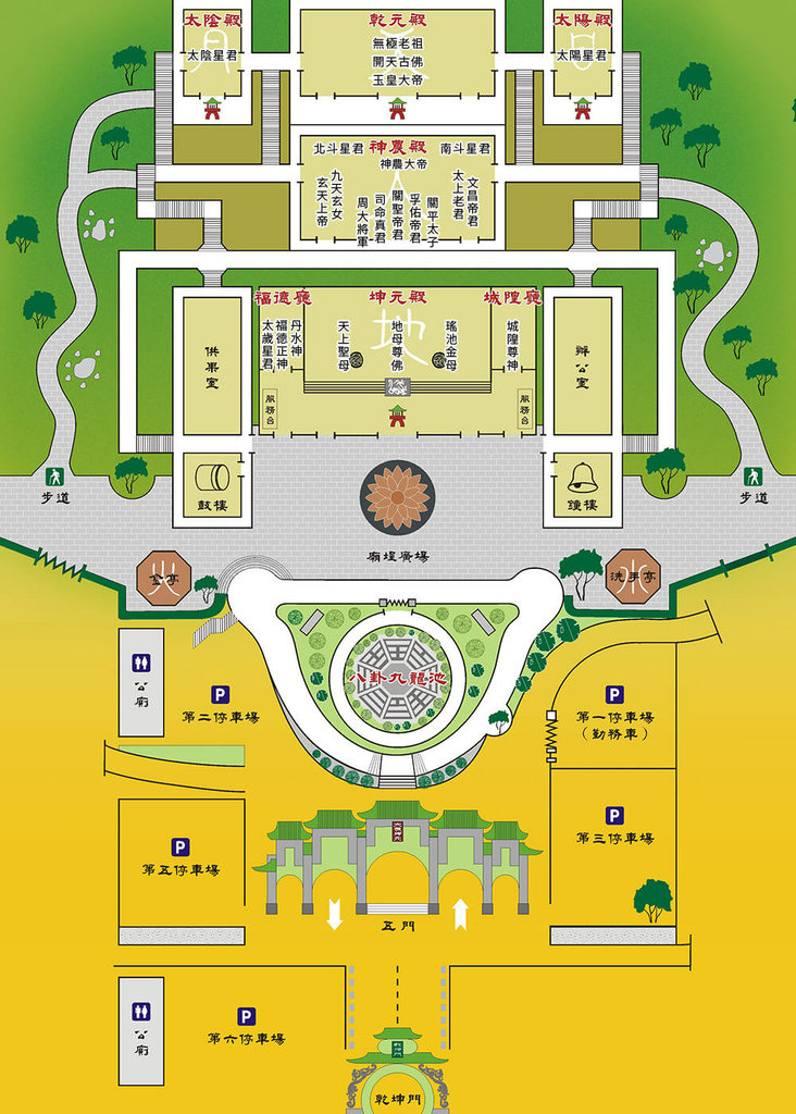 (上圖摘自官網)地母廟是依「天地雙全」的設計理念,即天宮(乾元殿、太陽殿、太陰殿、神農殿)與地宮(坤元殿)搭配而建的完整五殿格局,共祀「地母」(地母至尊)與「天父」(無極老祖)外,也供奉玉皇大帝、關聖帝君、文昌帝君、天上聖母...等,還有近年爆紅的「九天玄女」,官網上有個宮殿的導覽介紹
