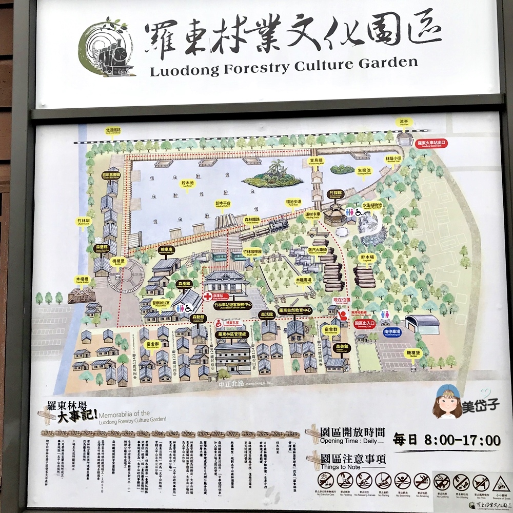 來看一下羅東林區文化園區的導覽圖,下方還有林場的大事記。這篇分享後補的遊記(2019年暑遊的最後一篇),幾年的時間過去,林場也有一些小改變。