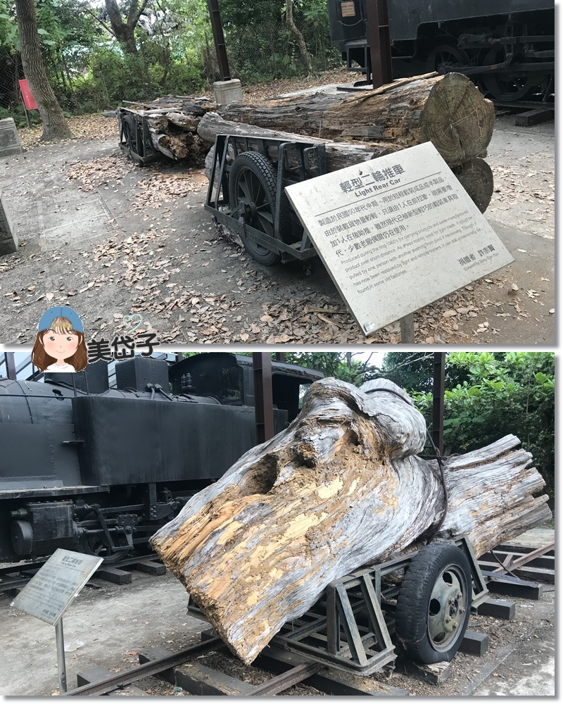 在木雕廣場,有廢棄的軌道、停駛的蒸汽火車頭,也有原木陳列存放在板車上,似有還原林鐵運送木材現場的概念。