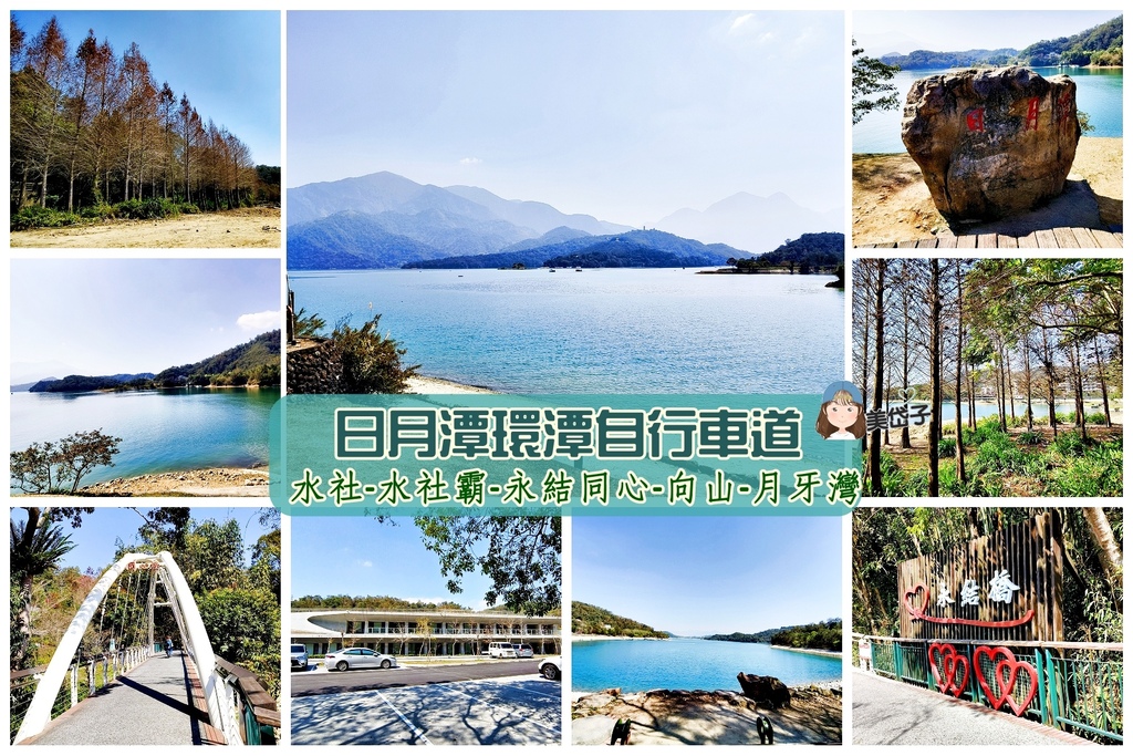 ),就是騎單車環潭繞一圈。目前日月潭自行車道區分有向山段、月潭段、水社段、依達邵段、松柏崙段,另有一條挑戰級的潭南段,主要的「環潭」車道則是向山、月潭、水社、依達邵、松柏崙等五段,沒有過騎單車環潭的經驗者,可以向山段開始;這回騎單車環湖的走的就是向山段,外加一半的月潭段,啟程經過落羽松-水上自行車道-水社壩-永結同心橋-向山遊客中心-月牙灣,至月牙灣後原途返回,來回時間剛剛2小時(電動車),美景多多,照片也多多,一起來看看吧!