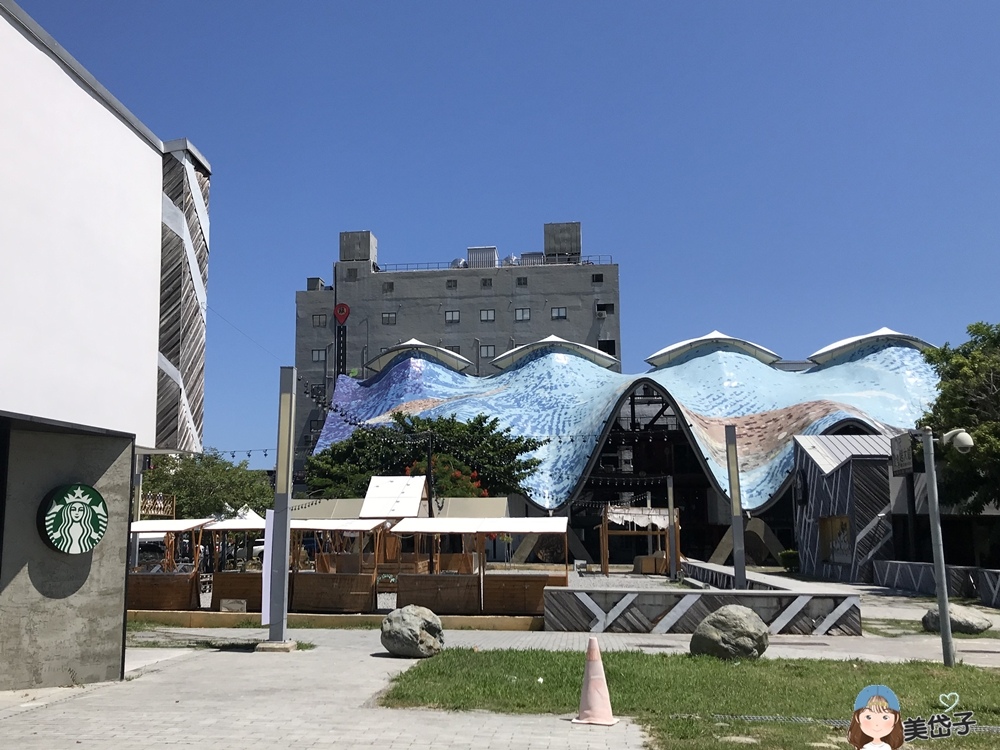 處在鐵花新聚落的星巴克台東新生門市,刷白的牆面、簡單的結構和波浪屋互別苗頭對視著。