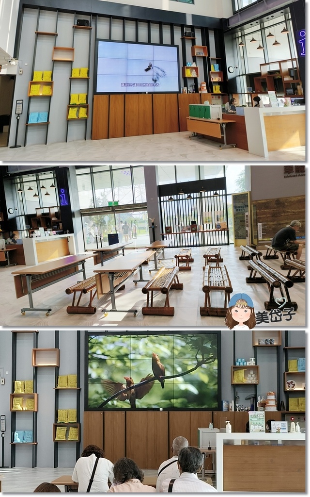 從外看起來遮掩隱密的外壁,入門後卻是透亮清晰,服務資訊台就位在門邊,入門後有竹子編製的椅座,供遊客觀賞影片使用。