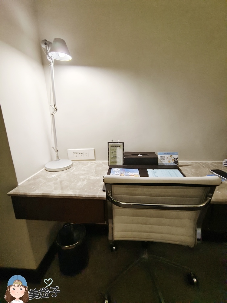 事誤桌空間,大理石板面有質感,一盞滷素燈照明,很方便旅人使用。