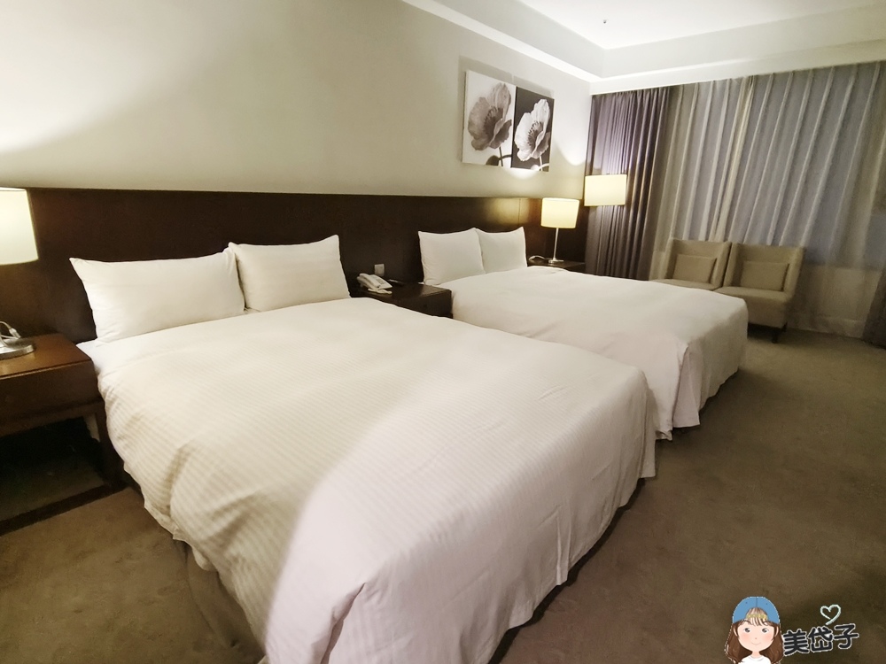 家庭房,2張雙人床,簡約高雅設計,地毯和空間色系融合,有舒適感。床舖、枕頭的軟硬度很OK,好睡唷!