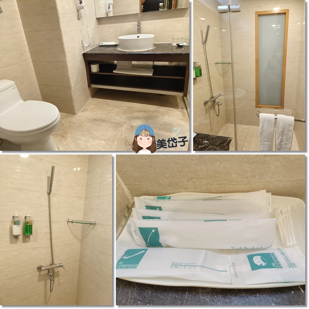 大理石磁磚的浴廁空間很大氣,掛壁飾吹風機是比較沒那麼方便的設計,浴帽、刮鬍刀、牙膏&牙刷也依房型提供(2025年起已不主動提供一次性盥洗用品)。