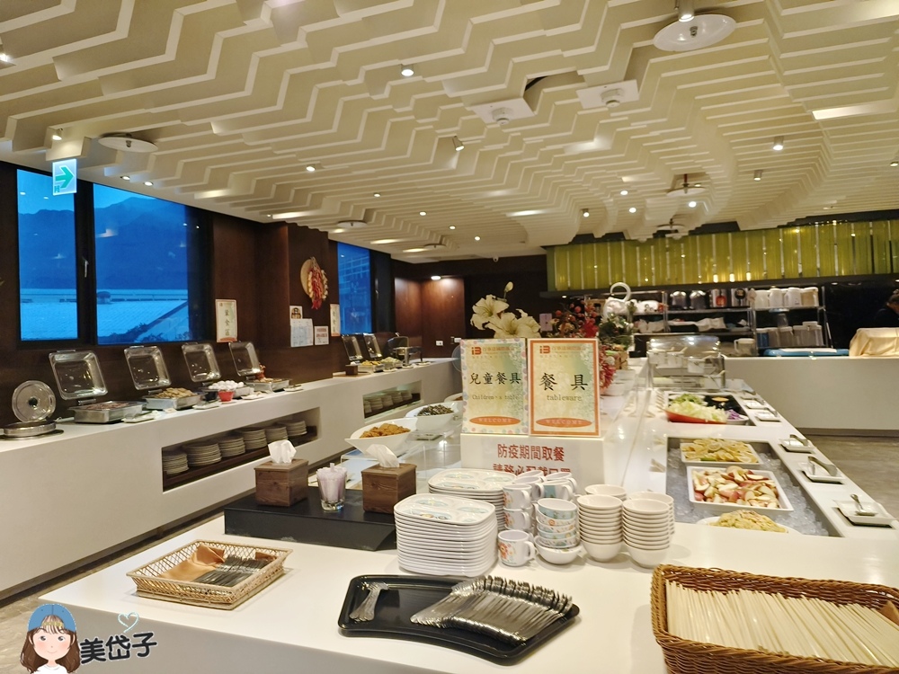 餐具自取,也提供兒童餐具;豐盛的早膳多數放置在三排臺架上。