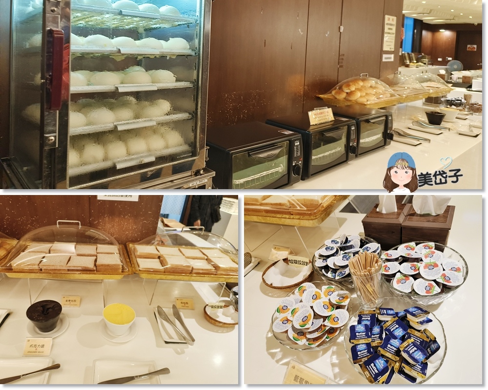 包子、饅頭、餐包和吐司、果醬則是另一側的架面上。