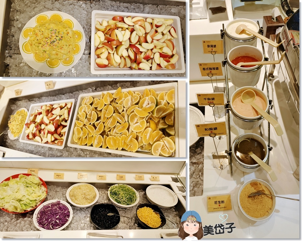 生菜沙拉(有脆藻...第一回見到)、水果(蘋果、柳橙)還有洋芋沙拉,佐醬也有多款。