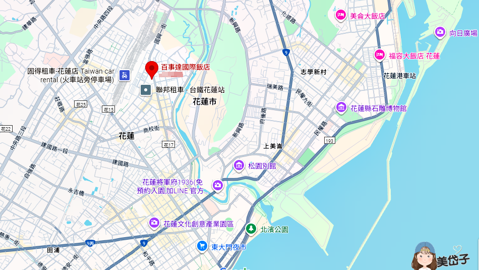 2014年開幕的百事達國際飯店位在花蓮市中心,距離花蓮火車站步行約10分鐘即可抵達,交通挺便利的,距離花蓮文創產驗園區、將軍府、松園別館、東大門夜市等知名景點也不遠,地理位置佳。飯店出來走幾步路就有24H營業的便利商店(7-11),是鬧中取靜又方便的舒適飯店。