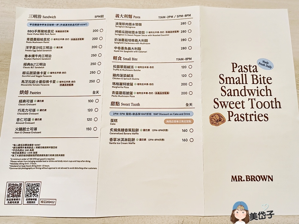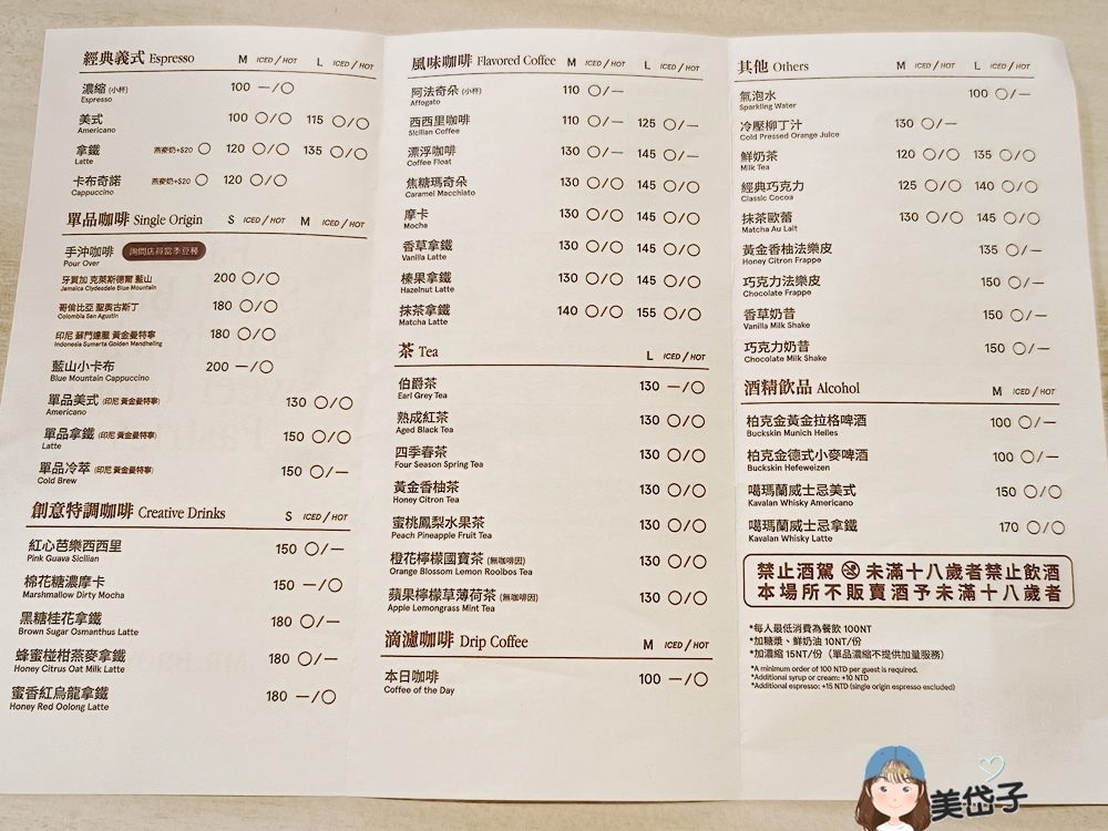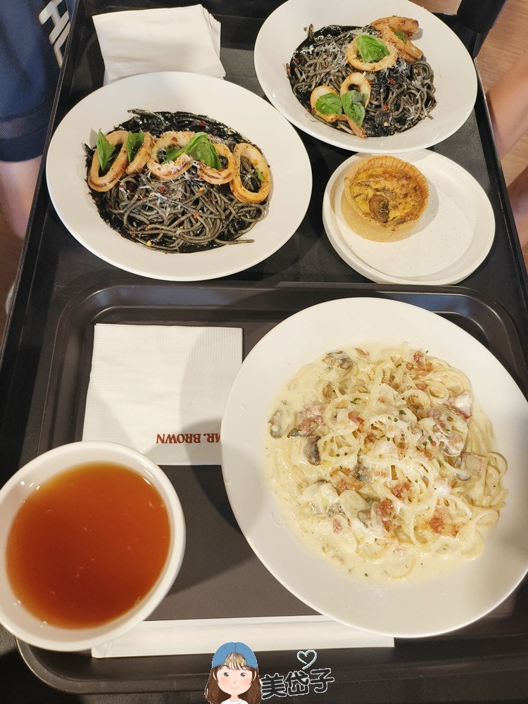 Mr. Brown咖啡館採用的是半自助式,使用後的餐盤也是要自助放置收納處,所以免收服務費~當天只有美岱子是點飲品......唯一的一杯顯得特珍貴,口感沒有特別突出(心中最愛水果茶還是玫瑰園)。為什麼沒點拿鐵反而點了水果茶呢?原來是因為那天早上已經喝過拿鐵咖啡了,為避免咖啡因過量,就捨棄了。