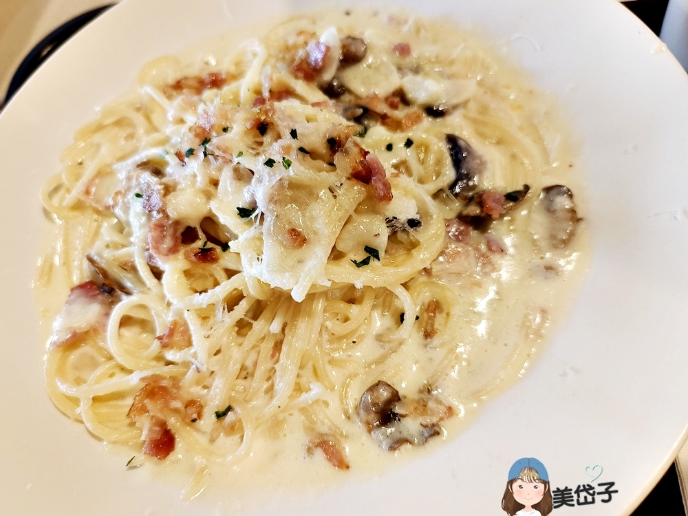 最認真享用的應該是兒子,他點了「奶油蘑菇培根義大利麵」,奶味香濃,培根碎末和蘑菇片參差點綴,在一片奶色中成了出色點,量不多,對大食量的朋友來說應該不足量。
