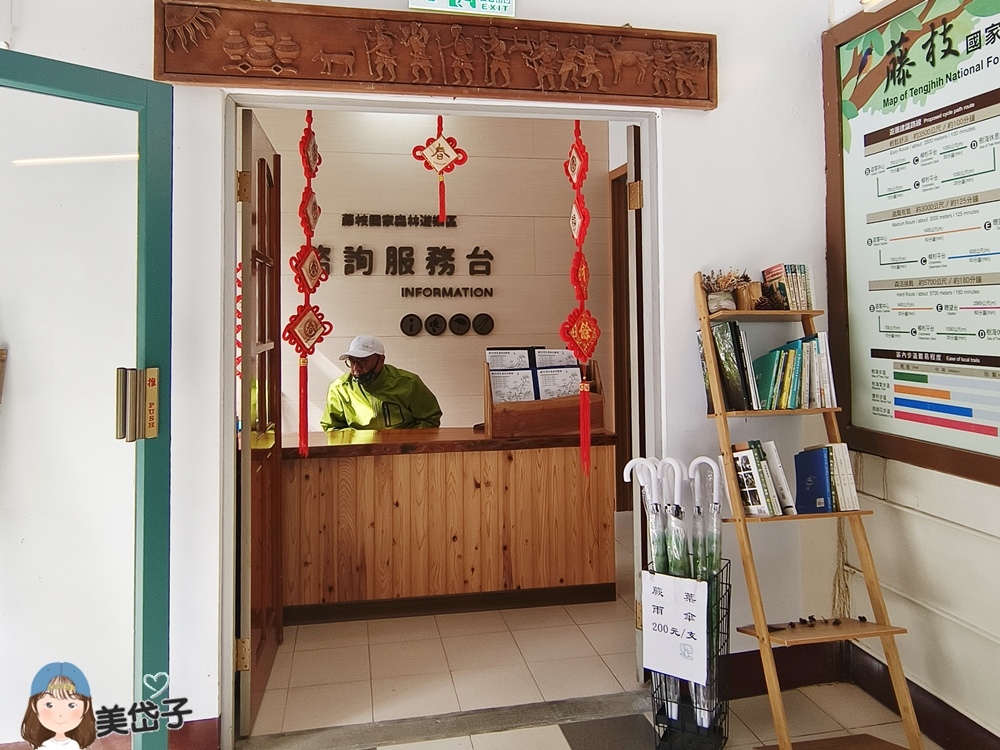 踏入遊客中心,左手邊有一小小的辦公室,這裡就是旅遊諮詢站,當然也是提供解說服務中心,20人以上(20-120人)的團體可提前(10天前)預約免費導覽,此處最吸引美岱子的是門上方的木雕,有部落故事意義(藤枝區域多為布農族群)。
