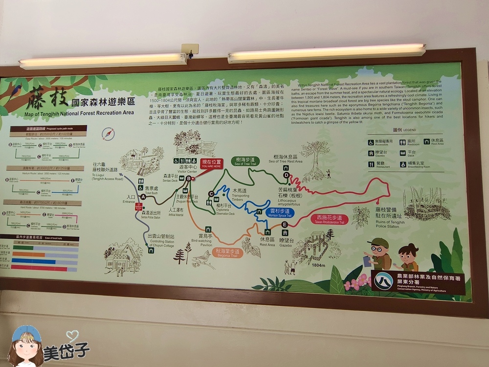 諮詢站前有一大篇幅的藤枝國家森林遊樂區地圖(路線圖),也有分難易度的行徑介紹;這篇幅一時沒能記入腦海也沒關係,可以拍下來,也可以在諮詢服務站索取紙本地圖。