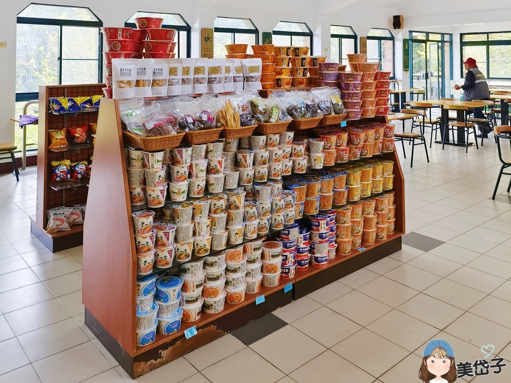 讓美岱子驚訝的是滿滿一櫃的泡麵和另一滿櫃的零食,第一回在遊客中心看到這麼多(量/款)的泡麵被陳列販售,也許是因為位在山區,泡麵是最直接可以暖胃、止飢的速食品。